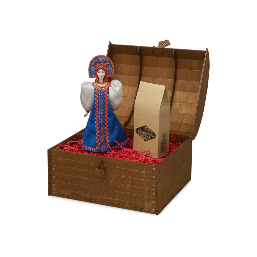 - Набор поставляется в большой деревянной коробке в виде сундука с замочком, который можно брендировать шильдом спектрум, что придает подарку особую атмосферу сокровища и делает его не только вкусным, но и памятным. Комплектность: кукла фарфоровая 25±3 см, чай фруктовый, 70 г.