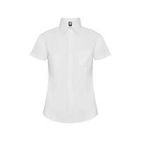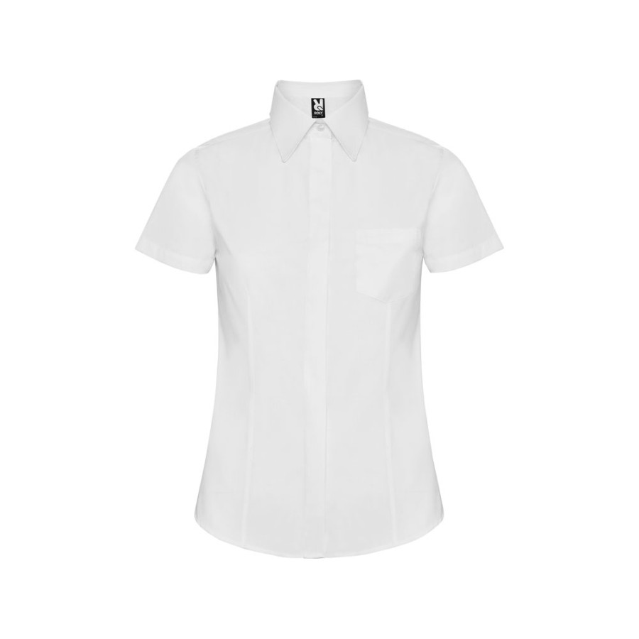 Рубашка женская прилегающего силуэта с вытачками на полочке и спинке с коротким рукавом. Накладной карман на груди слева, закругленный низ изделия. Планка с потайными пуговицами.