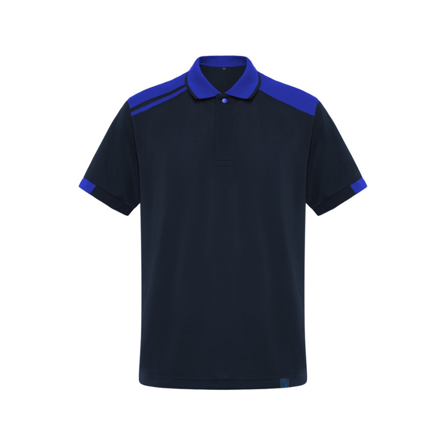 Рубашка-поло с коротким рукавом в двухцветной комбинации. Воротник и половина рукава отделана рибом 1x1. Планка на 2 пуговицы. Усиленные закрытые швы по воротнику. Боковые разрезы внизу. Контрастные плечи и детали. Дополнительный контрастный карман.