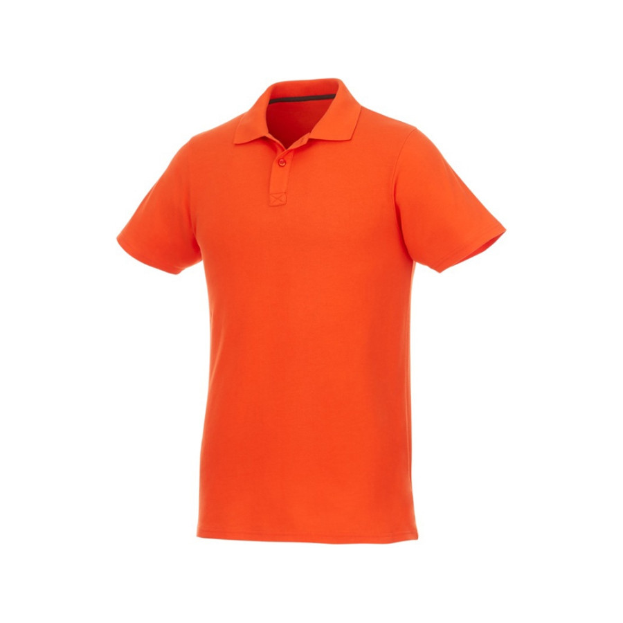 Мужское поло Helios с коротким рукавом. Отрезной-отрывной ярлык для комфорта. Воротник гладкой вязкой в рубчик. Планка с двумя пуговицами. Двойная строчка на воротнике и внизу изделия. Пуговицы в цвет изделия. Полоска на горловине в контрастном цвете. Трикотаж Piqué, 100 % хлопок. 180 г/м².
