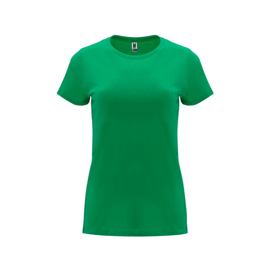 Женская приталенная футболка. Круглый вырез горловины обработан рибом 1х1. Шов горловины укреплен тесьмой.