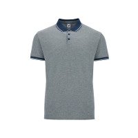 Рубашка поло с коротким рукавом. Манжеты и воротник из однотонного риба 1х1 с контрастными полосками. Планка на 3 пуговицы. Низ с боковыми разрезами, отделанными тесьмой. Спинка немного длиннее полочки. Полотно с меланжевым эффектом.