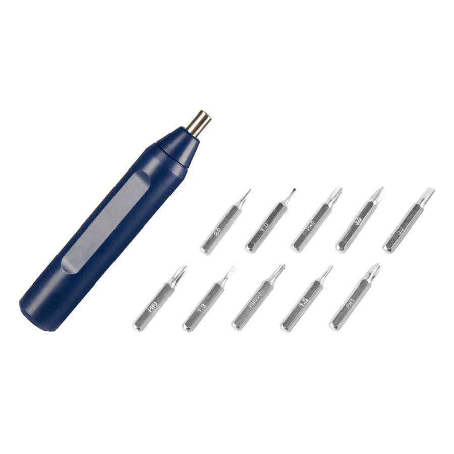 Отвертка-ручка Drill это универсальная отвертка с сменными битами. Благодаря форме корпуса идеально лежит в руке. Отвертка легкая и занимает мало места. Выдвижной механический контейнер бит позволяет хранить в себе весь набор из 10 сменных бит. Ручка инструмента изготовлена из пластика, биты – из нержавеющей стали. Комплектность: 10 бит-насадок, ручка-отвертка