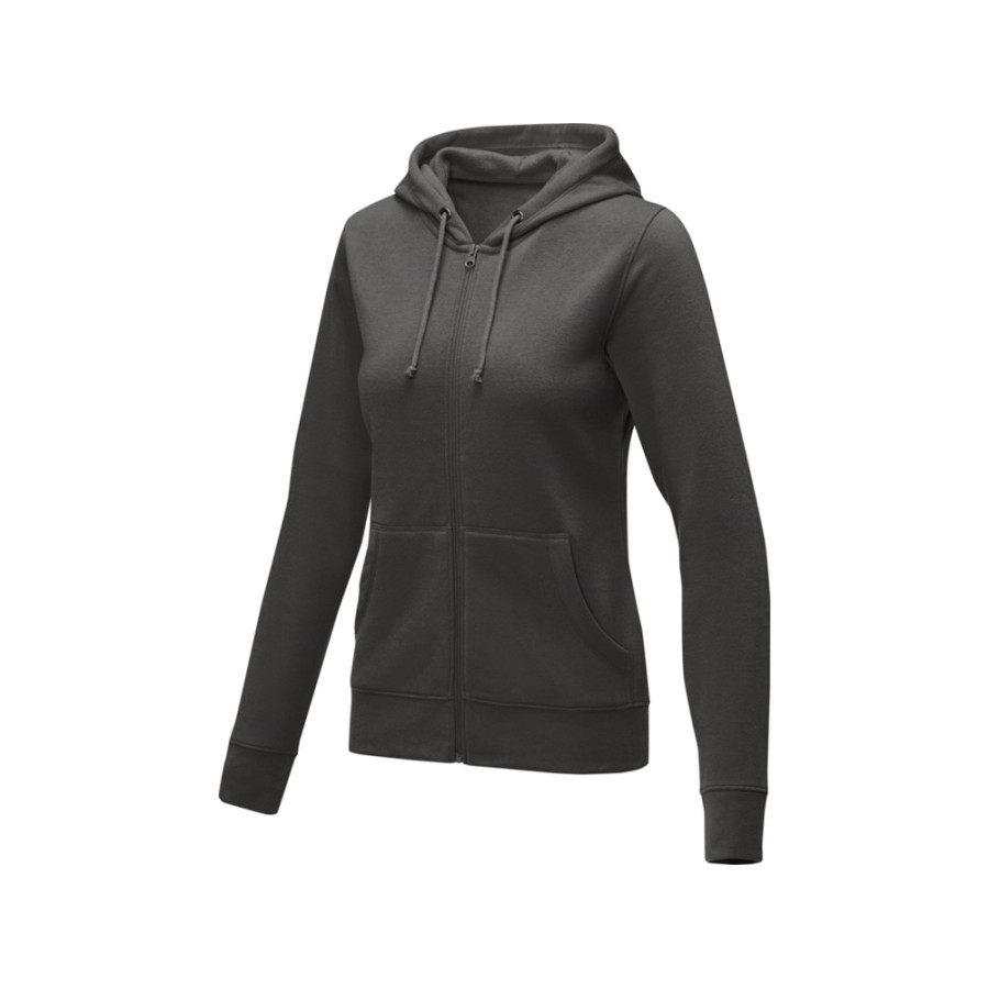 Женская толстовка на молнии Theron. Основная этикетка, которую можно оторвать или отрезать, без неудобных пришитых ярлыков. Завязки на капюшоне. Расположенная по центру молния. Карман кенгуру. С подшивкой из гладкого трикотажа в рубчик. С манжетами из гладкого трикотажа в рубчик. Внутренняя сторона покрыта ворсом. Тесьма из основного материала по внутренней стороне горловины. Придающие форму швы и зауженная талия для ровного прилегания. Трикотаж 50% Хлопок, 50% Полиэстер, 240 g/m2.