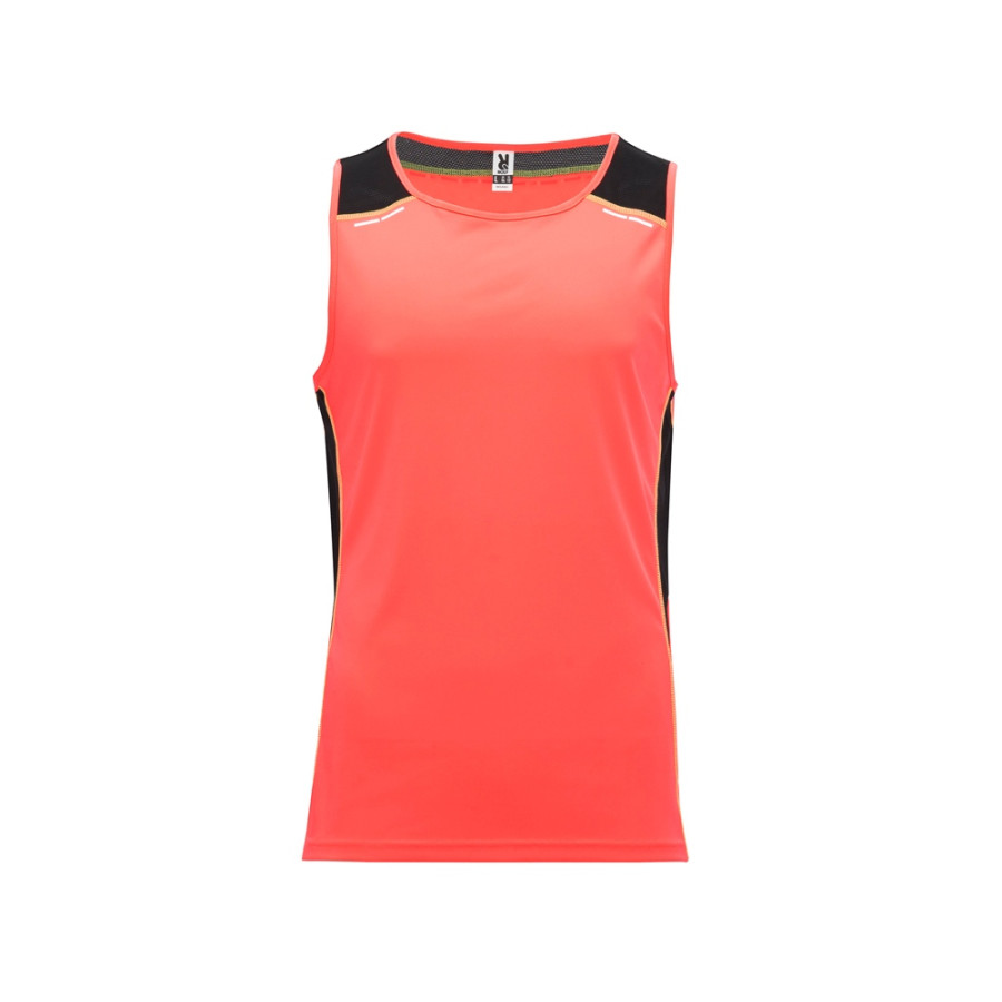Спортивная майка со светоотражающими деталями. Круглый вырез горловины укреплен декоративной строчкой. Комбинация двух полиэстеровых полотен: основное полотно интерлок, боковые и верхние вставки из микроперфорированного полотна для повышенной воздухопроницаемости. Технологичное полотно быстро сохнет.