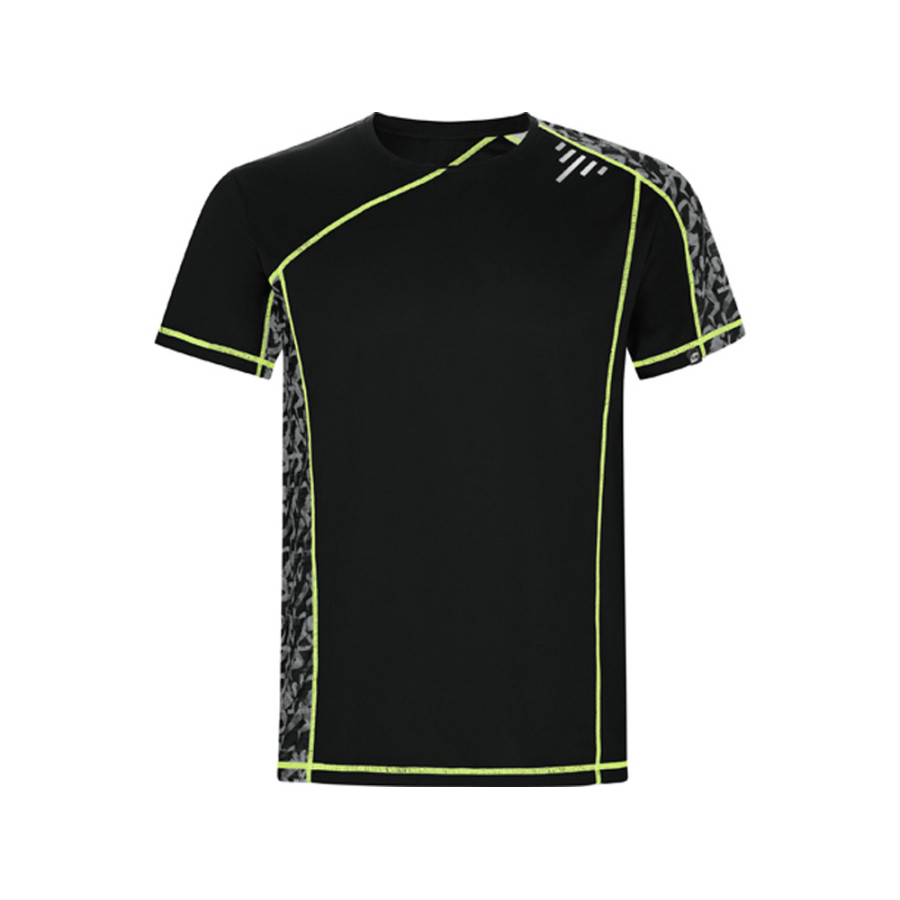 Спортивная футболка с коротким рукавом и принтованными вставками. Контрастные отстрочки плоским швом, светоотражающие элементы на полочке и спинке. Эко лейбл на рукаве.