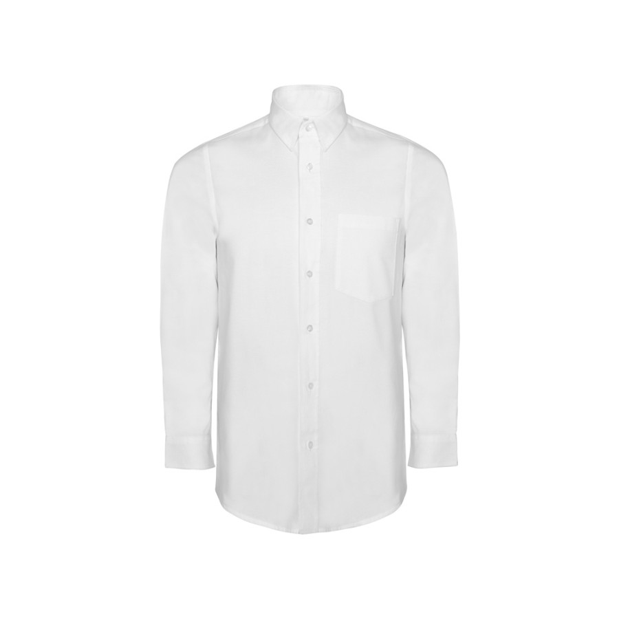 Мужская рубашка с длинным рукавом, накладной карман слева. Планка на пуговицах. Отложной воротник на стойке. Манжета регулируется по ширине с помощью 2-х пуговиц. Кокетка на спинке.
