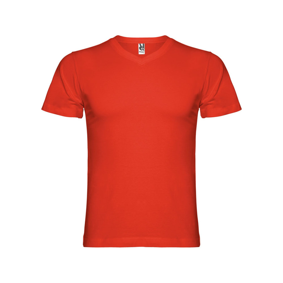 Мужская футболка без боковых швов с коротким рукавом и V-образным вырезом горловины, отделанном рибом 1х1. Горловина и плечевые швы дополнительно укреплены тесьмой.