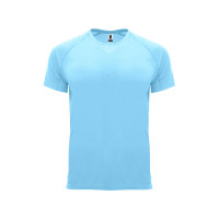 Спортивная футболка с коротким рукавом реглан. Круглый вырез горловины с отделкой плоским швом. Рукав сложного кроя для обеспечения дополнительного удобства при занятиях спортом. Отделка плоским швом с застилом по пройме и рукавам.