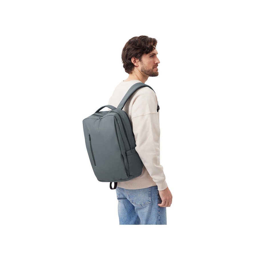 Непромокаемый бизнес рюкзак с двумя вместительными отделениями и карманом на молнии спереди. В одном отделении расположены карман для ноутбука и планшета, в другом органайзер и много пространства для одежды и других вещей на случай деловой поездки. На сетчатой спинке расположен потайной кармана на молнии для документов и личных вещей и ремень для крепления на ручку чемодана. Сверху удобная мягкая ручка для переноски. Лямки регулируются по длине.