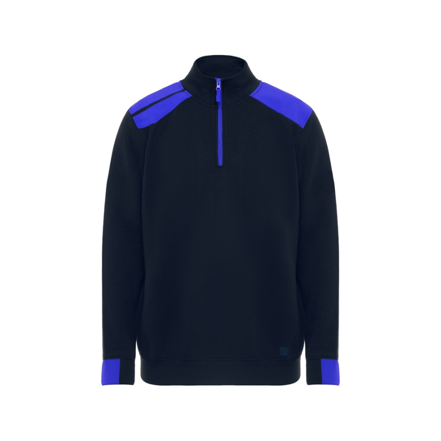Толстовка с воротом- стойкой на молнии с сочетанием двух цветом. Половина манжет и низ изделия из рибового полотна 1х1. Укрепляющая отстрочка по внутреннему воротнику. Контрастные плечи, детали, молния и манжеты