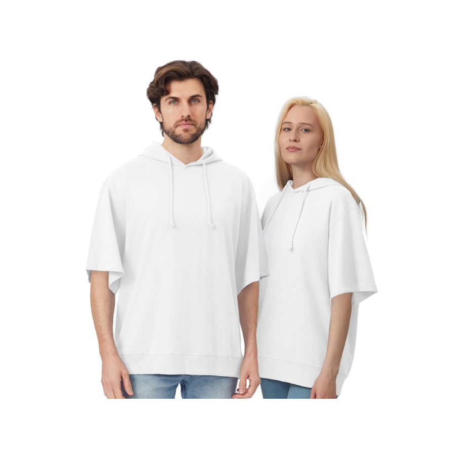 Худи с коротким рукавом выполнено из хлопкового френч терри с петельками на изнаночной стороне. Подкладка капюшона выполнена из основного полотна для объемной посадки. Модель комфортной и актуальной посадки оверсайз отлично подходит для обычной жизни и в качестве промо мерча.