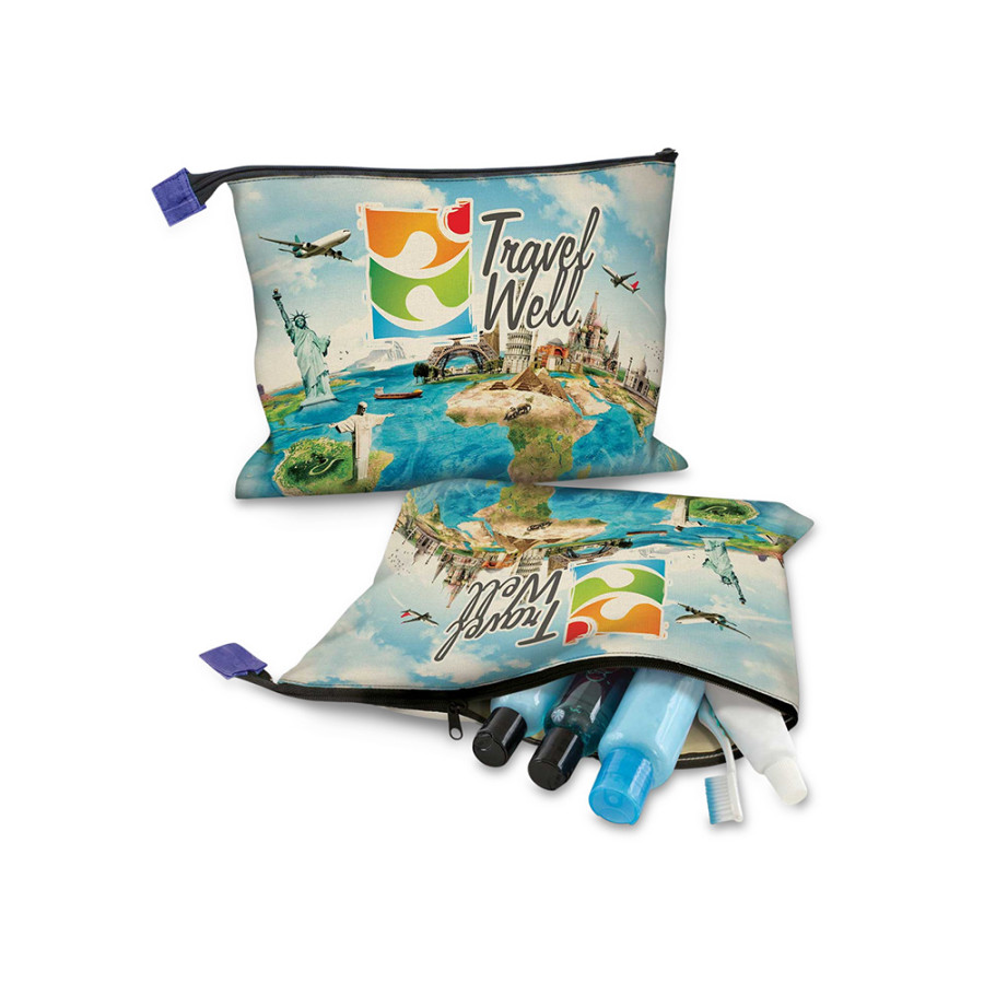 Дорожная косметичка из натурального хлопка - незаменимый спутник в поездках. Классическая форма и мягкий материал позволяет компактно хранить косметику и гигиенические принадлежности, необходимые в дороге. Яркий элемент - цветная вставка на хлястике молнии, доступна в 16 цветах. Полноцветная печать доступна на обеих сторонах.