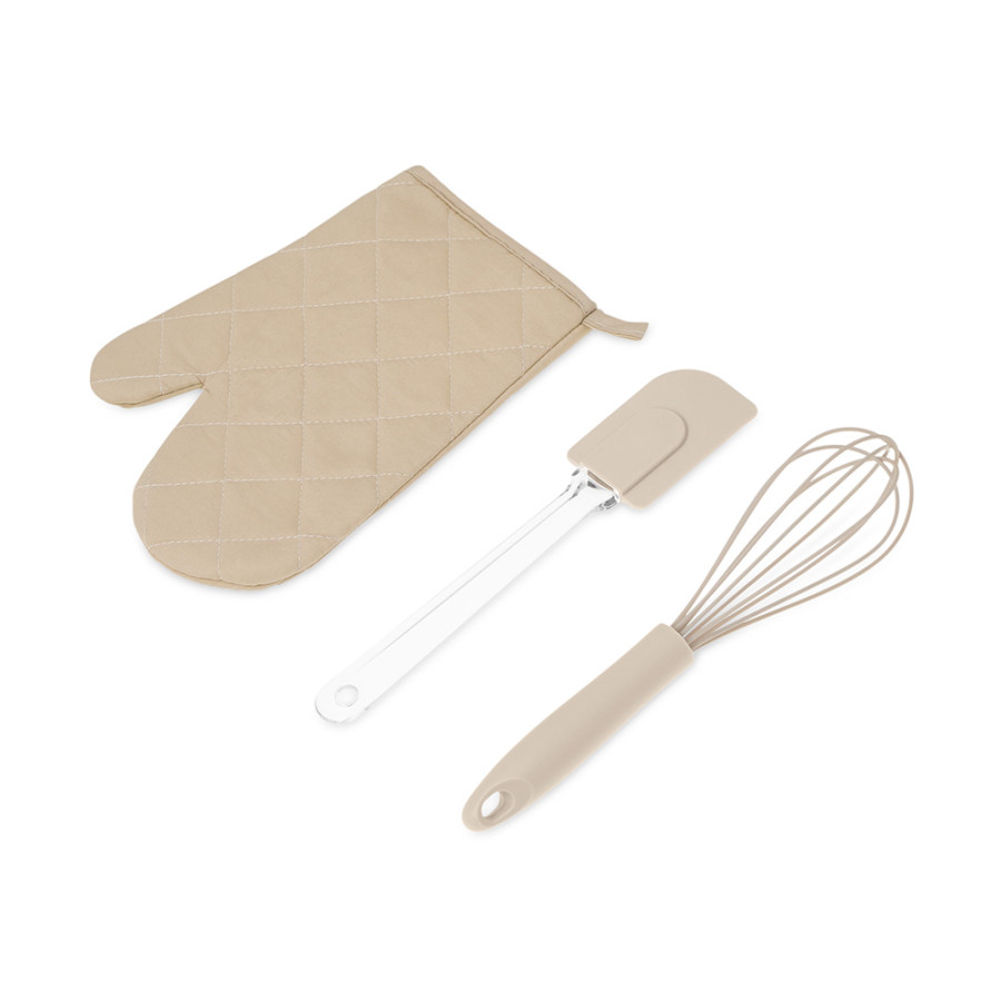 Набор Canele состоит из трёх предметов, без которых не обходится приготовление ни одного пирога или торта: венчика для взбивания яиц или крема, лопатки и прихватки для горячего.