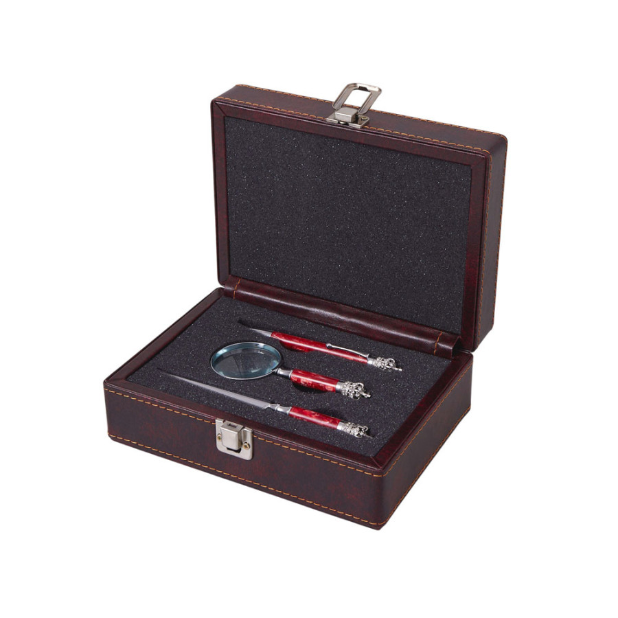 Подарочная упаковка: Набор представлен в жестком футляре из бордовой сплит- кожи с поролоновым ложементом, который гарантирует сохранность аксессуаров и подчеркивает ценность подарка.