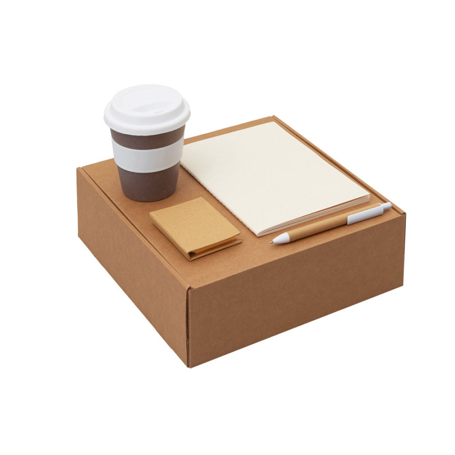 | Материал: | блокнот- бумага из переработанных тетра-паков, ручка- картон, пластик, стакан- 50% бамбуковое волокно, 50% полипропилен, коробка- картон |