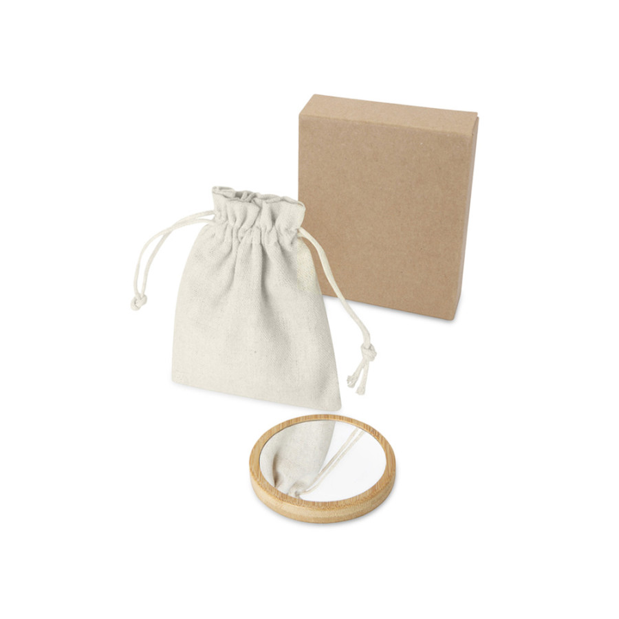 Круглое зеркало из бамбука в хлопковом мешочке.