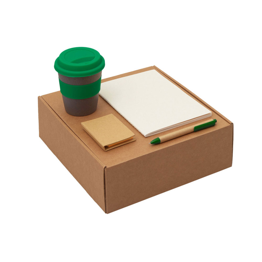 | Материал: | блокнот- бумага из переработанных тетра-паков, ручка- картон, пластик, стакан- 50% бамбуковое волокно, 50% полипропилен, коробка- картон |