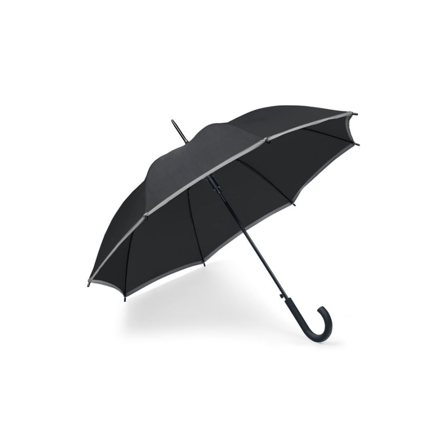 Полуавтоматический зонт-трость из полиэстера со светоотражающей окантовкой и прорезиненной ручкой. Вид нанесения, рекомендуемый поставщиком: трансфер, текстильный принтер