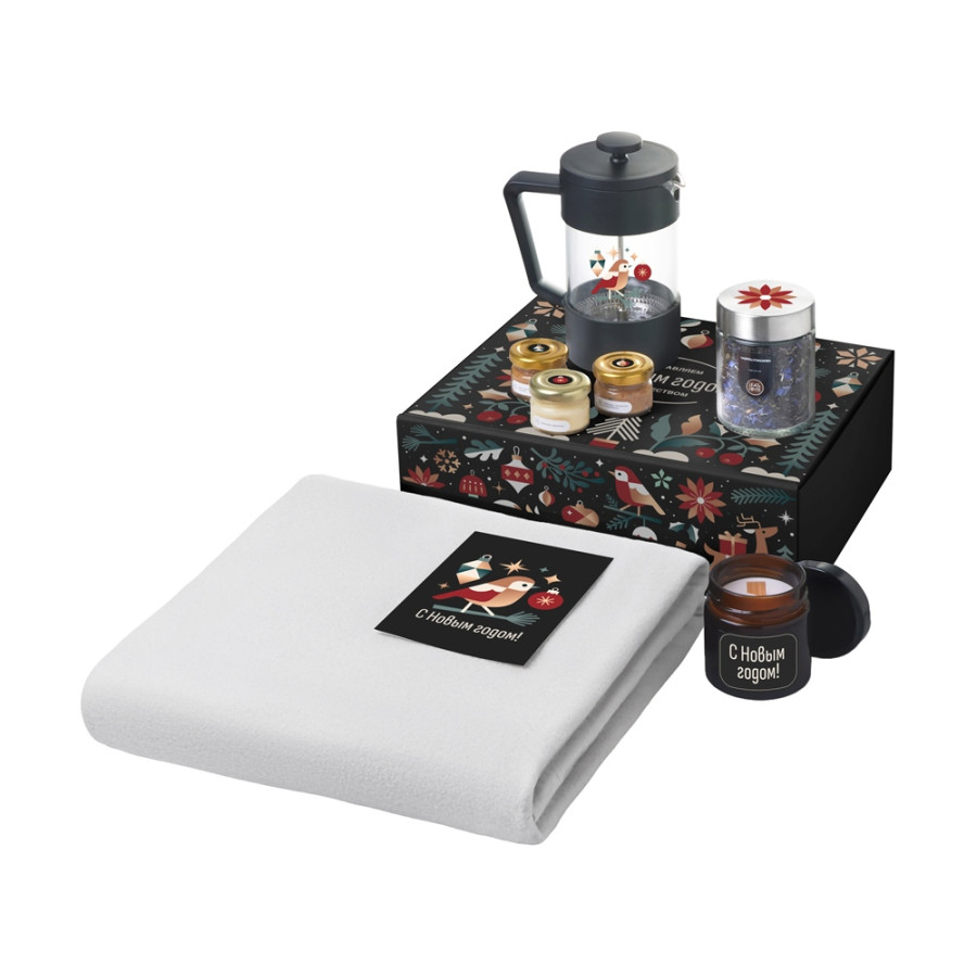 | Материал: | плед - флис 100% полиэстер; френч-пресс - боросиликатное стекло, нержавеющая сталь, пластик; открытка - бумага; мешок - нетканый материал (спанбонд) |