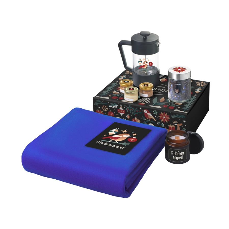 Подарочный набор c пледом, френчпрессом, чаем и медом, синий