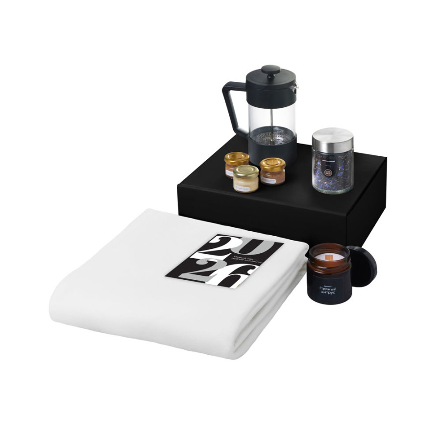 Подарочный набор c пледом, френчпрессом, чаем и медом, белый