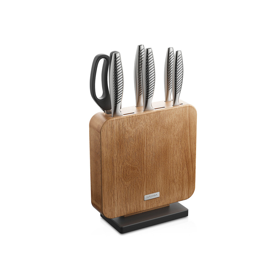 Набор цельнокованых ножей и ножниц в блоке включает в себя ножи: поварской 20 см, разделочный 20 см, Сантоку 18 см, универсальный 12, 5 см, овощной 9 см и кухонные многофункциональные ножницы.