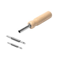 Отвертка из нержавеющей стали с круглой деревянной ручкой. В комплекте две биты с 2 насадками под крестовую и плоскую отвертки.