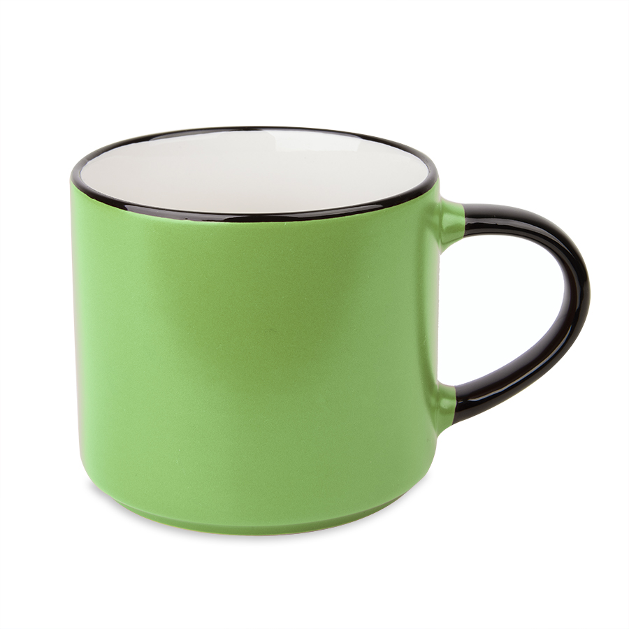 Ёмкая кружка трендовой цилиндрической формы с матовым покрытием. Яркий цветной корпус с черной ручкой и кантом по краю.