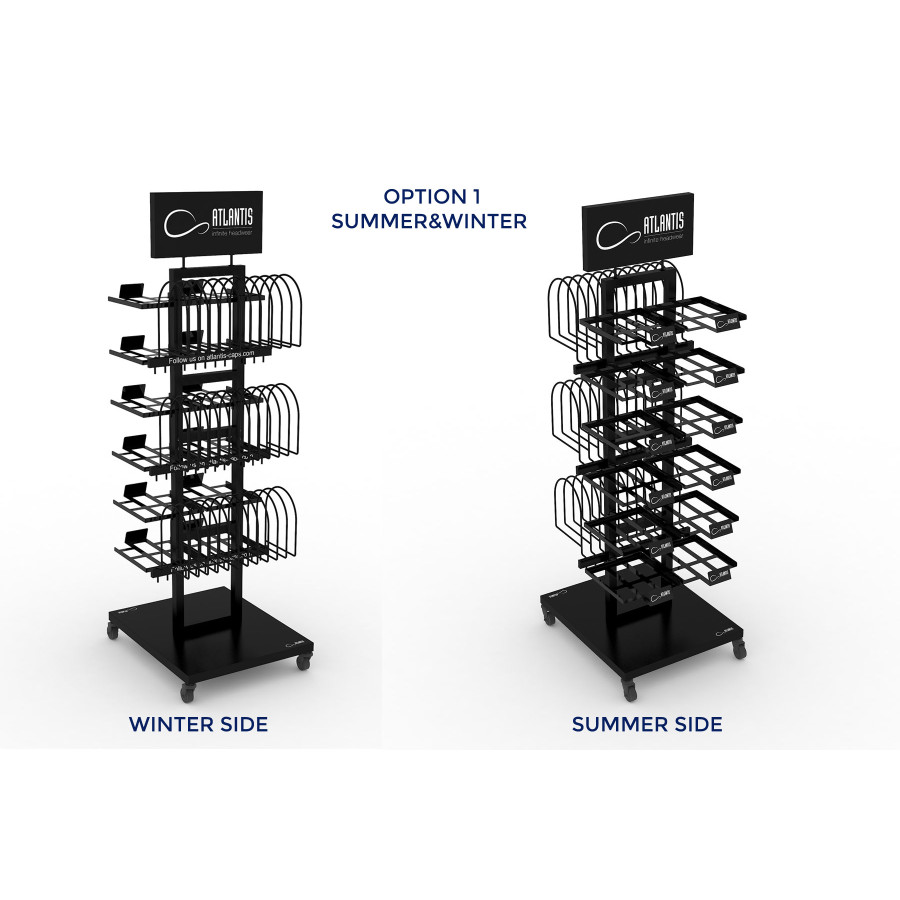 Стойка напольная укомплектована полками для бейсболок (24 штуки) и крючками для шапок (36 штук). Вы сами сможете собрать как летний вариант стойки, состоящий только из бейсболок, так и зимний (только шапки), либо же разместить и то, и другое одновременно. Образцы продукции Atlantis: