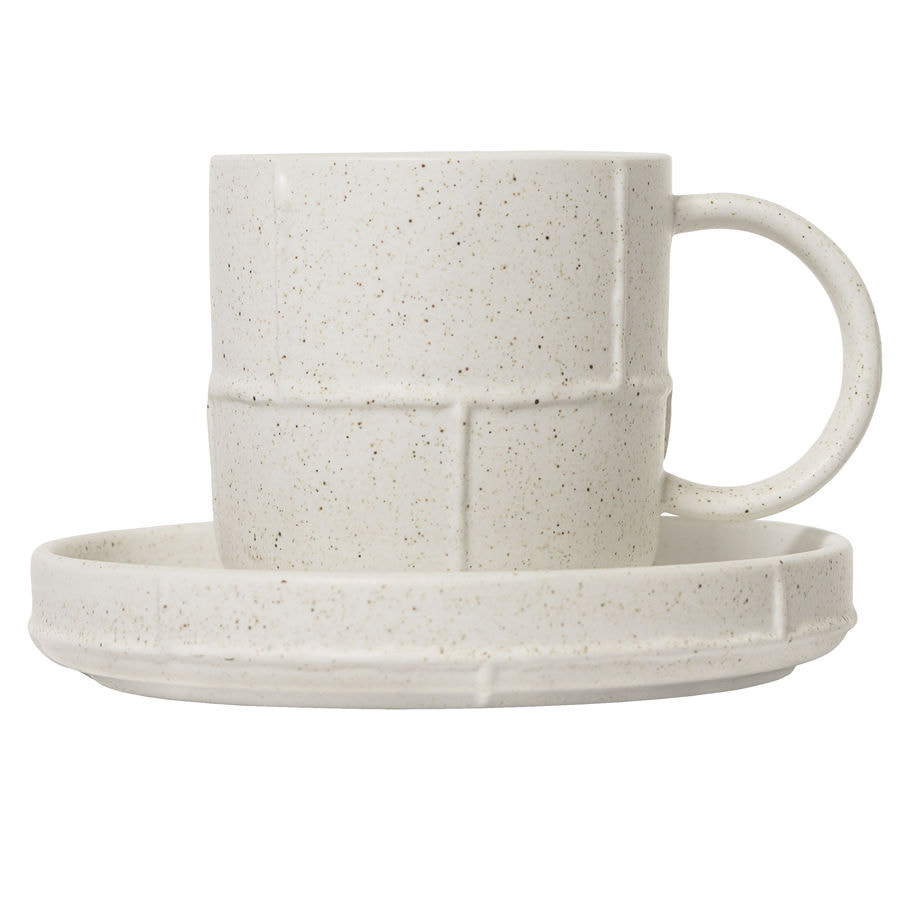 Оригинальная фарфоровая чайная пара цвета топленого молока в легкую крапинку со швами станет эффектным и запоминающимся подарком.