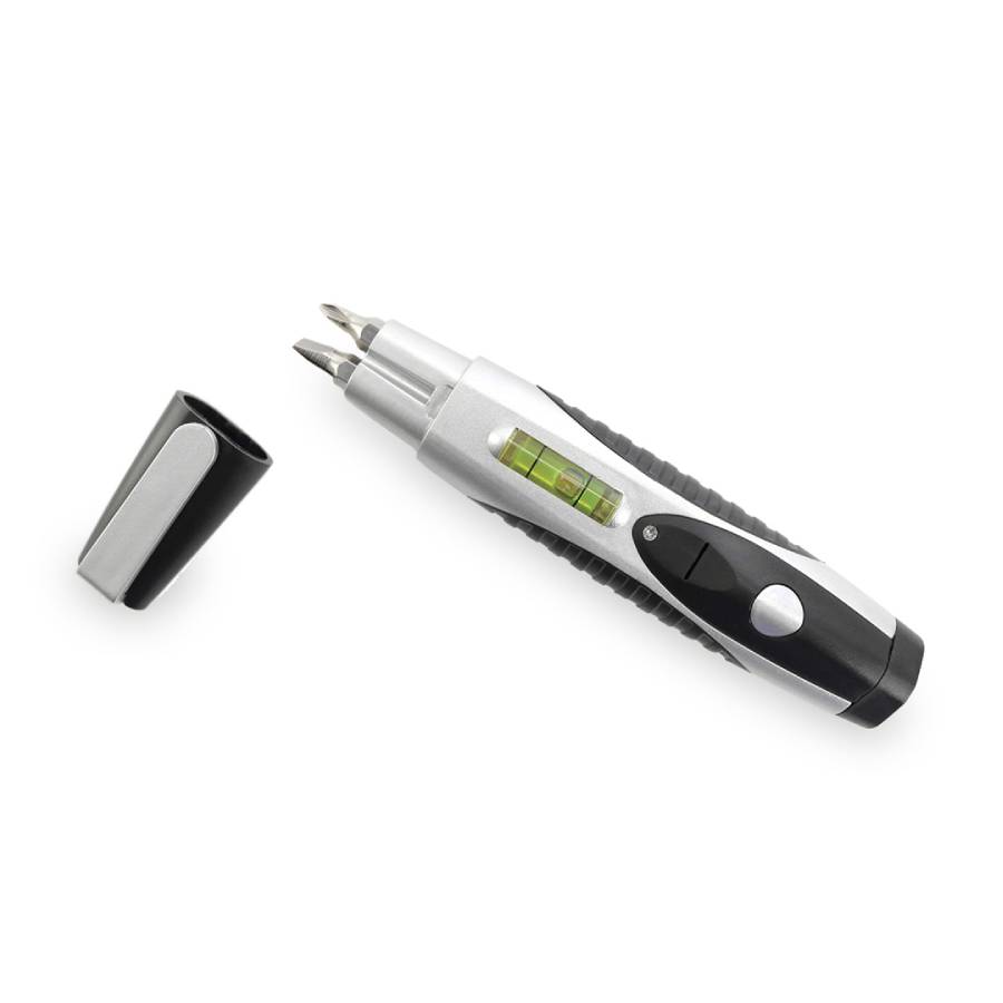 Мультитул с устойчивым нескользящим корпусом и 4 аксессуарами. Включает в себя 2 головки отверток с плоской и крестообразной головкой,