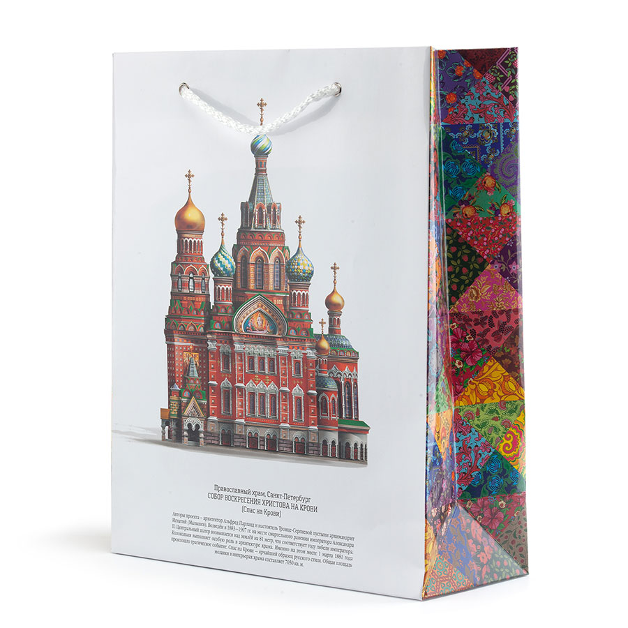 Подарочный прочный ламинированный пакет с люверсами и плетёными верёвочными ручками из толстого шнура. Пакет снабжен авторской иллюстрацией и описанием истории собора Спаса на Крови на русском, английском и китайском языках и в этом смысле не имеет аналогов. Боковые стороны пакета украшены эффектным рисунком в стиле пэчворк, напоминающим лоскутное одеяло.