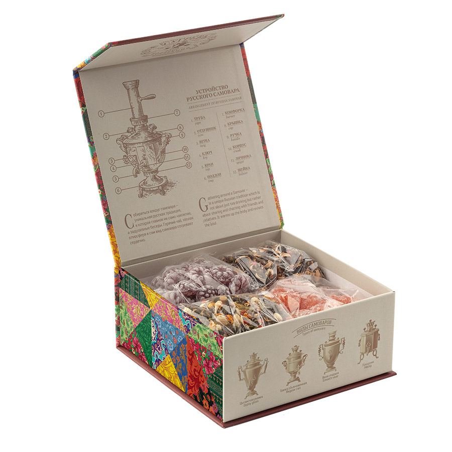 Вкусный и элегантный подарок. Набор представляет собой метафору весны. В шкатулке с великолепным дизайном вы найдете, как оригинальные чайные купажи с лепестками цветов, так и натуральные сладости: леденцы со вкусом смородины, кумкват.