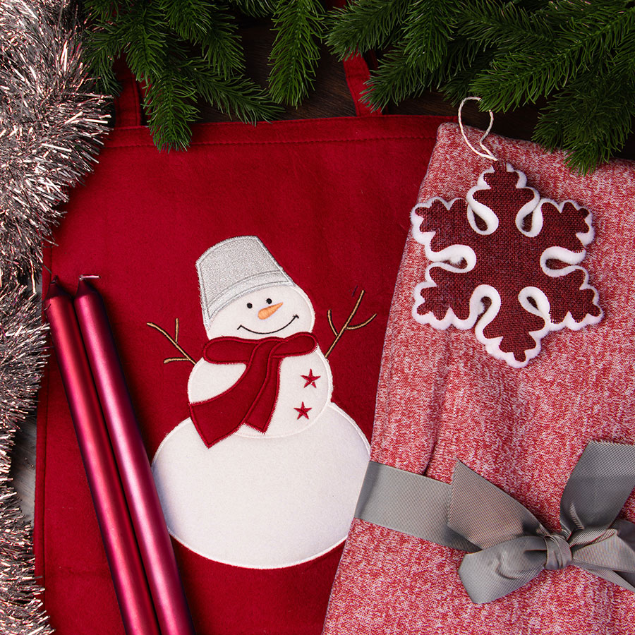 Набор подарочный NEWSPIRIT включает в себя: сумку Снеговик (20601/08), плед (345217/08), свечи (20904/08) и новогоднее украшение (56000/08).