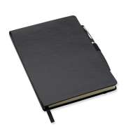 Блокнот A5 с обложкой из картона, 72 линованных листа, с лентой- закладкой, перетянут резинкой. Включает металлическую шариковую ручку с синими чернилами.