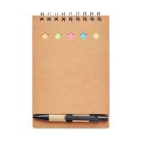 Блокнот на 40 листов переработанной бумаги, 5 цветных закладок и блок из 20 стикеров. Шариковая ручка из картона. Черные чернила.