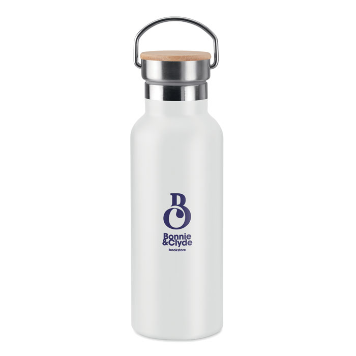 Термос-бутылка вакуумная двустенная из нержавеющей стали. Объем 500 мл. Винтовая крышка со вставкой из бамбука. При гравировке металлической части корпуса вскрывается темно-серебристый матовый цвет.