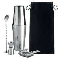 Набор бармена для создания коктейлей: шейкер 750 мл. , мерный стаканчик, коктейльная ложка и барное ситечко. Упакован в холщовый мешок.