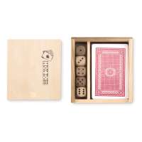 Карты игральные и кости в деревянной коробке. Кости деревянные (5 штук), карты бумажные (54 штуки).