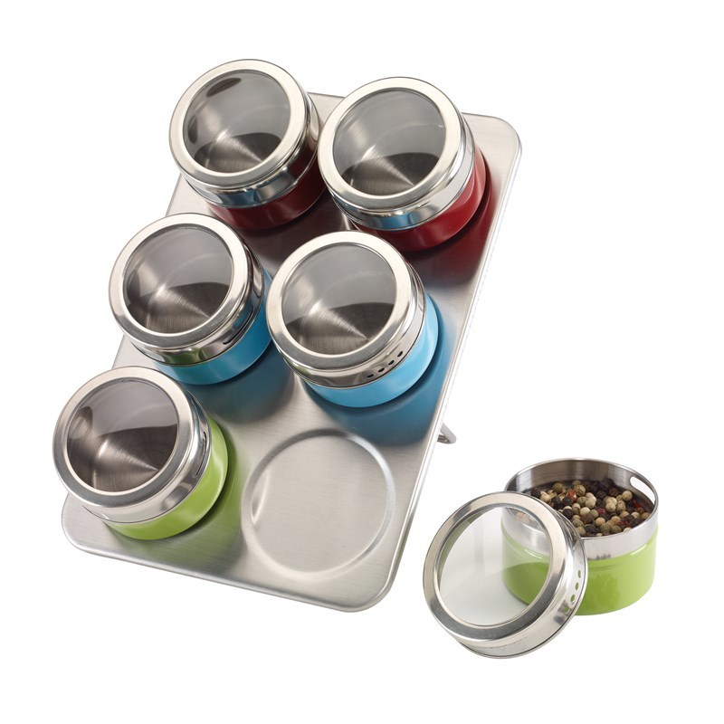 подставка для специй из нержавеющей стали FANTASTIK состоит из 6 цветных емкостей из нержавеющей стали с магнитным дном и прозрачным окошком в крышке и двумя дозаторами, упакована в коробку