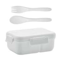 Двухуровневый пластиковый ланч-бокс с набором столовых приборов и ручкой. Общая емкость: 1000 мл