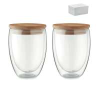 Набор стаканов из двустенного высокопрочного боросиликатного стекла с бамбуковой крышкой и силиконовым кольцом. Емкость 350 мл.