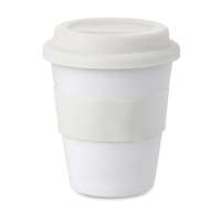 Одностенчатый стакан из блестящего белого полипропилена с силиконовой крышкой и ободком. Емкость 350мл. Поскольку это одностенчатое изделие, осторожно - может нагреваться!