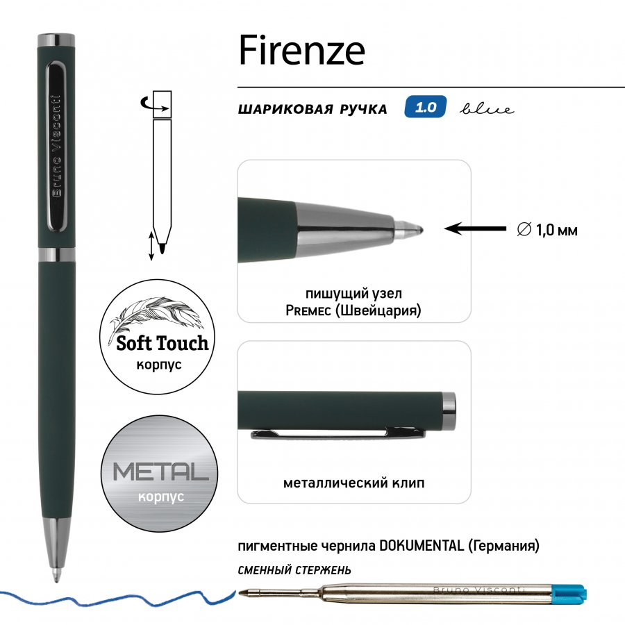 Ручка автоматическая, с легким поворотным механизмом подачи стержня. Надежный пишущий узел d 1, 0 мм (от швейцарского производителя Premec) гарантирует высокое качество так же, как и пигментные чернила Dokumental (Германия). Благодаря им писать ручкой «FIRENZE» одно удовольствие – она мягко скользит по поверхности бумаги, оставляя ровную, четкую линию.