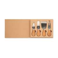 Набор из 4 ножей для сыра из нержавеющей стали с ручками из каучукового дерева. Представлен в подарочной коробке из гофрированного картона.