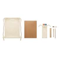 Набор для рисования и канцелярские принадлежности из 5 предметов, включающие деревянную линейку, деревянную точилку, ластик, деревянный карандаш и картонную шариковую ручку. Дополнительно 10 карандашей для раскрашивания, бумага A4 из вторсырья 50 листов (100 страниц). Поставляется в хлопковом мешочке с завязками.