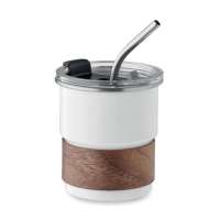Термокружка из переработанной нержавеющей стали 90% и 10% нержавеющей стали со съемной манжетой из дерева акации и соломинкой из нержавеющей стали. Герметичная крышка с отверстием для соломинки. Объем: 260 мл.