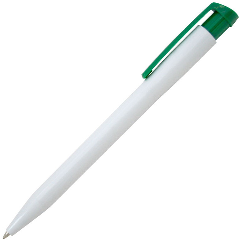 Ручка шариковая, пластиковая, белая/зеленая, механизм нажимной, цвет стержня синий, покрытие глянцевое, материал корпуса пластик, цвет корпуса белый