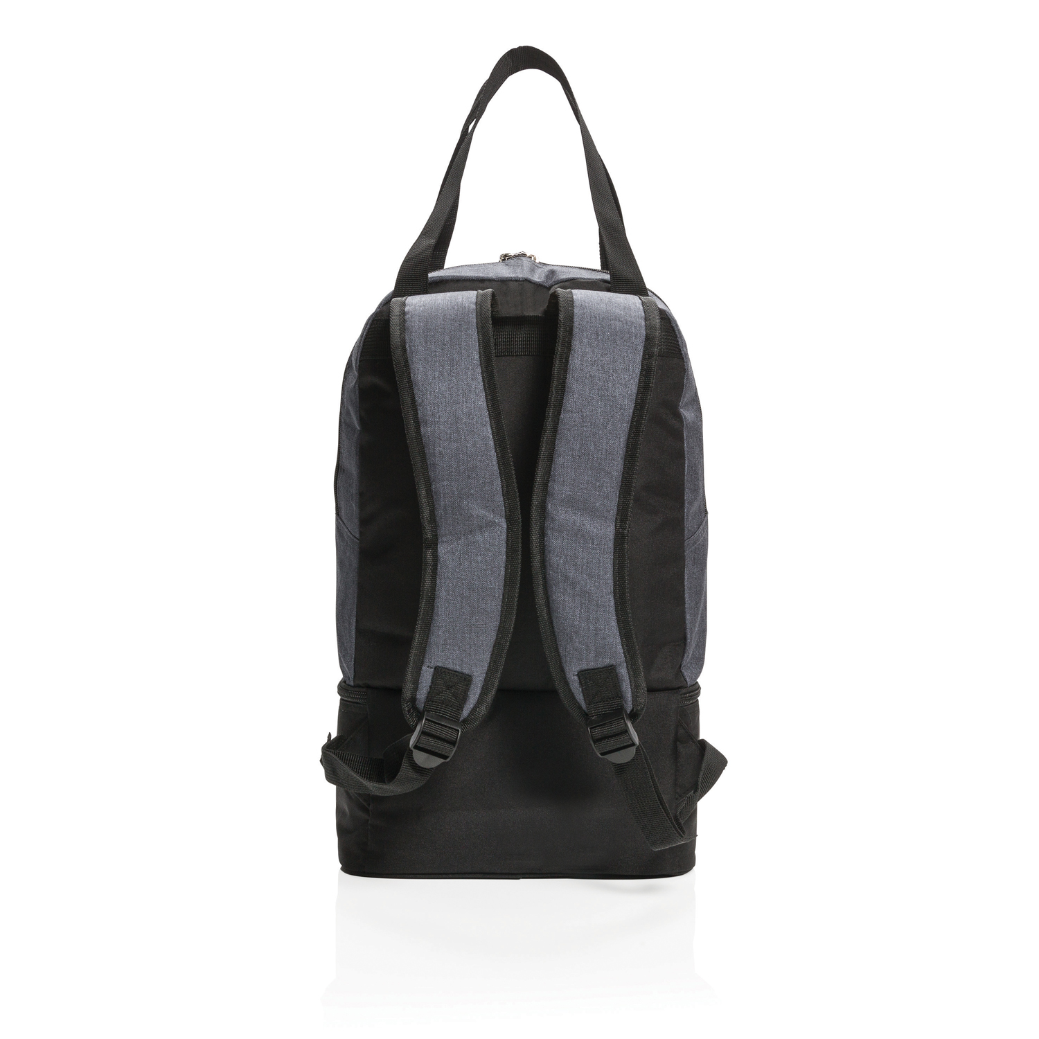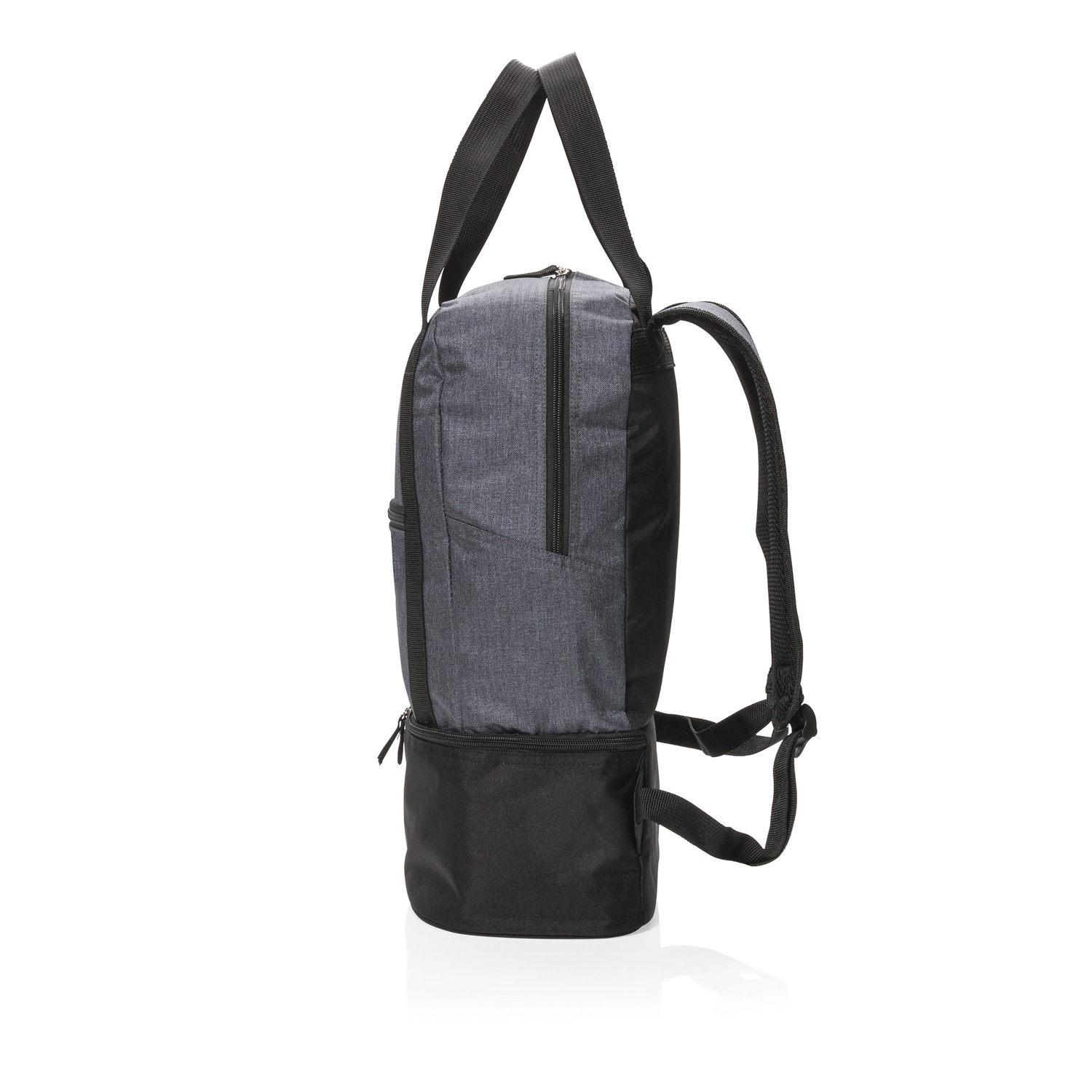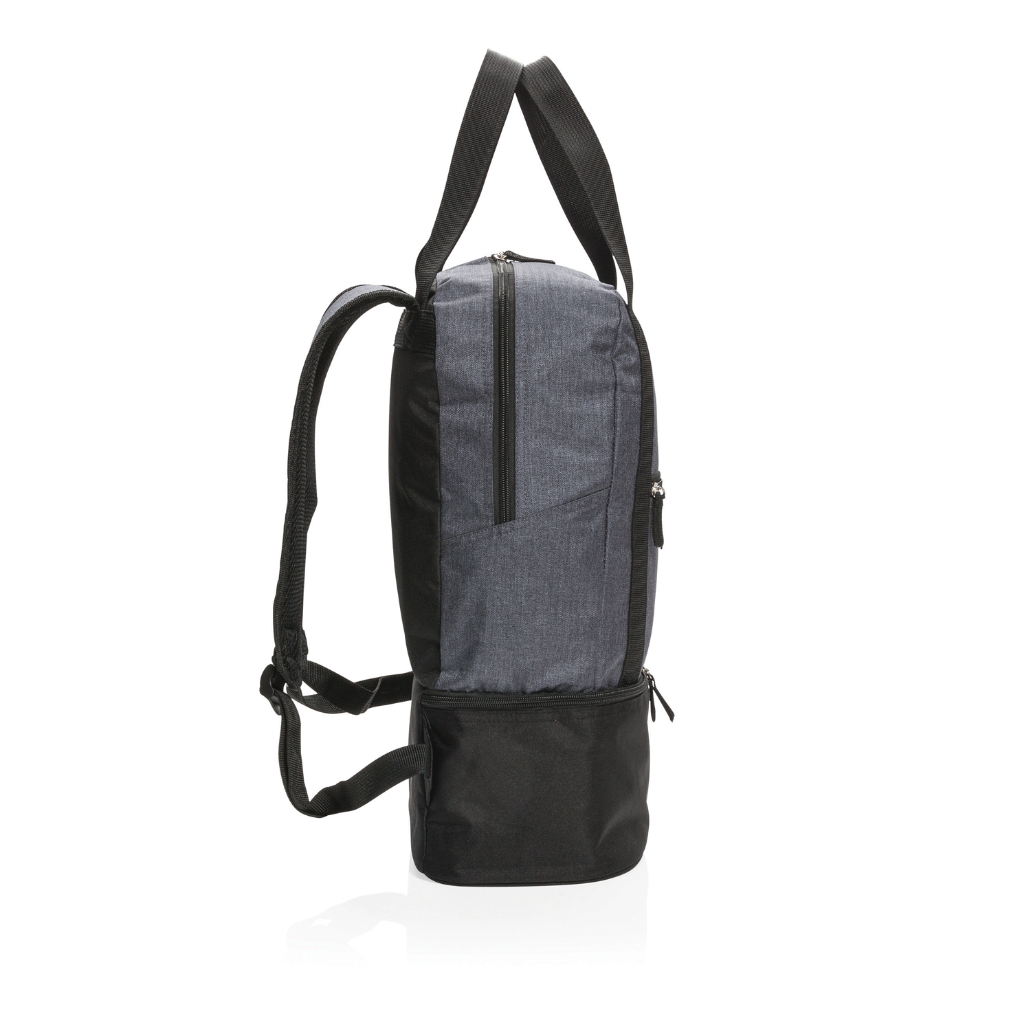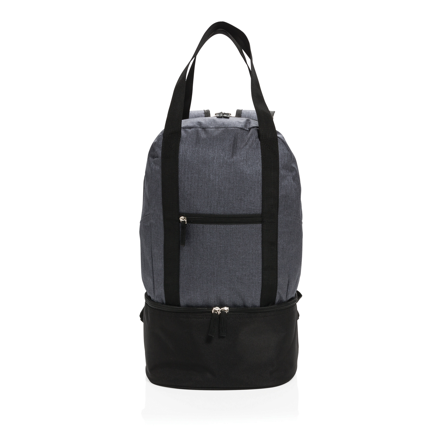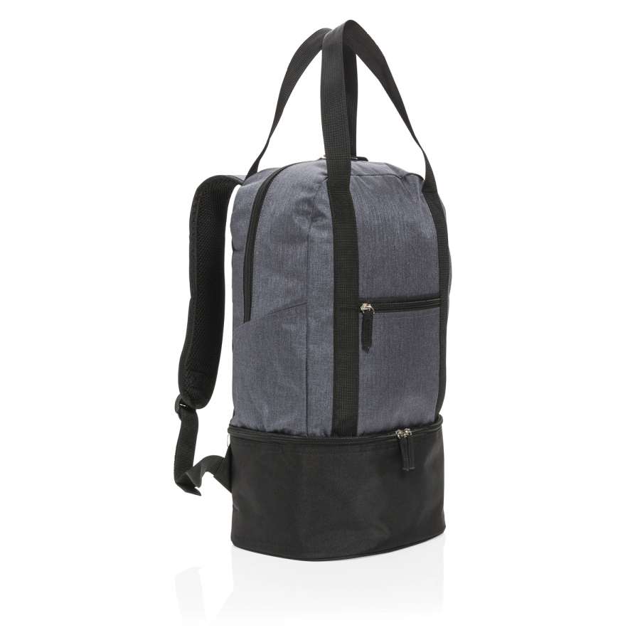 Этот оригинальный аксессуар непременно оценят хозяйки и любители пикников, ведь он совмещает в себе одновременно 3 функции. Нижнее отделение надолго сохранит температуру и свежесть продуктов (вмещает до 8 алюминиевых банок), а вместительное верхнее отделение отлично подойдет для других покупок или, например, для пляжных вещей. Комбинация прочных лямок и ручек позволяет выбрать, как удобнее нести вещи, на спине или в руках: это сразу и сумка, и рюкзак. Материал изделия – меланжевый полиэстер плотностью 500D.